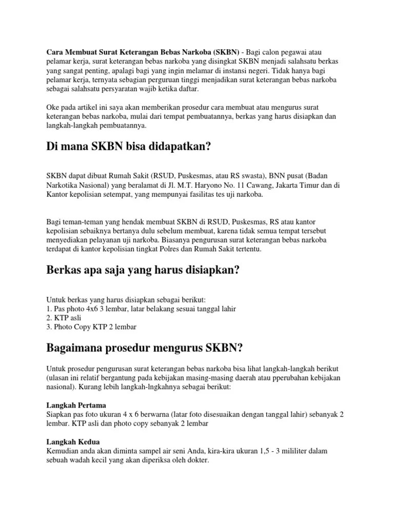 Jika saat ini kamu juga sedang dalam tahap atau hendak mengurus skbn, berikut beberapa informasi yang perlu diketahui perihal kegunaan, proses, dan cara mengurusnya sampai … Mungkin kalau surat keterangan bebas narkoba dari pihak kepolisian bisa hanya dari riwayat kriminal saja. Sehingga mungkin untuk dari pihak kepolisian, surat keterangan ini bisa didapatkan secara gratis. Terutama bila surat keterangan bebas narkoba itu dikeluarkan oleh pihak rumah sakit dan bnn. Untuk surat pernyataan bebas narkoba itu bisa kita buat sendiri tapi untuk surat keterangan bebas narkoba bisa di buat dari rumah sakit dan kepolisian. Surat bebas narkoba bisa didapatkan dari rumah sakit umum milik daerah, puskesmas, laboratorium bnn, dan kantor kepolisian. Surat keterangan bebas narkoba berfungsi untuk meyakinkan perusahaan atau lembaga lain bahwa anda bukanlah pecandu narkoba. Dan untuk mendapatkannya, pelamar harus mengurusnya ke kantor kepolisian setempat. Lihat juga contoh:surat dan contoh surat keterangan bebas narkoba dari bnn itulah beberapa contoh surat keterangan bebas narkoba. Format gambar contoh surat keterangan sehat rumah sakit pemerintah yang baik 2019. Cara membuat surat keterangan bebas narkoba. Contoh surat lamaran bebas narkoba. Contoh surat keterangan bebas narkoba dari kepolisian bagi contoh surat.